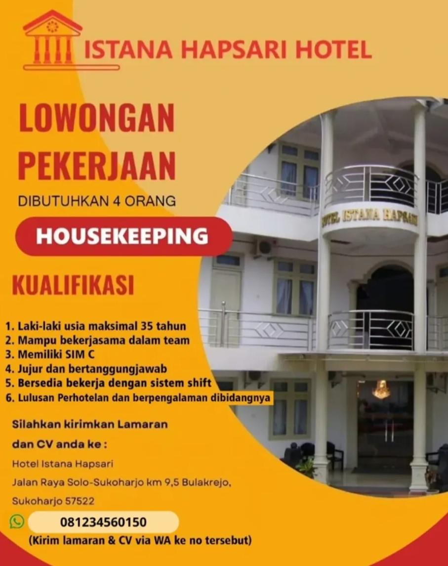 Kirimkan Lamaran dan CV anda ke: Hotel Istana Hapsari Jalan Raya Solo-Sukoharjo km 9,5 Bulakrejo, Sukoharjo 57522