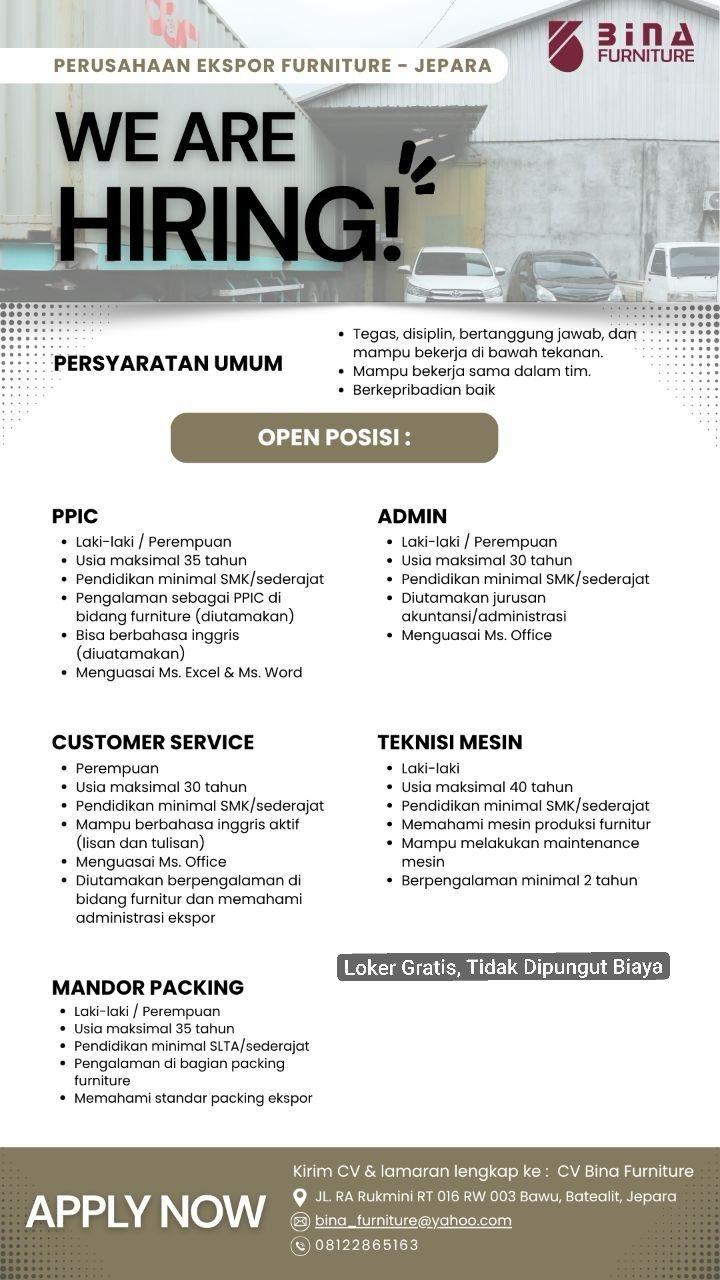 Bina Furniture, perusahaan ekspor furniture terkemuka di Jepara, sedang membuka kesempatan berkarir. Kami mencari individu yang bersemangat dan berdedikasi untuk bergabung dengan tim kami. Kami WE ARE HIRING!