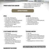 - Diutamakan berpengalaman di bidang furnitur dan memahami administrasi ekspor
