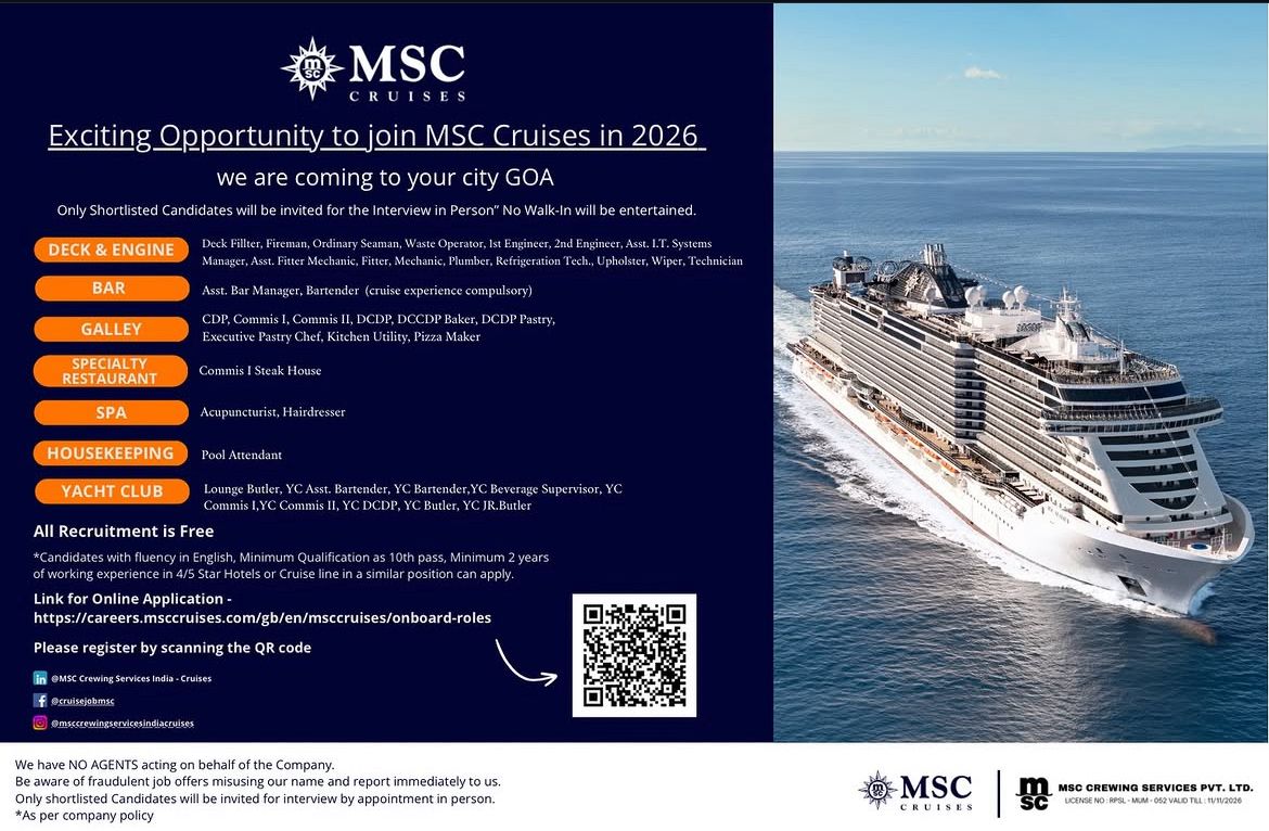 Exciting Opportunity to join MSC Cruises in 2026 We are coming to your city GOA