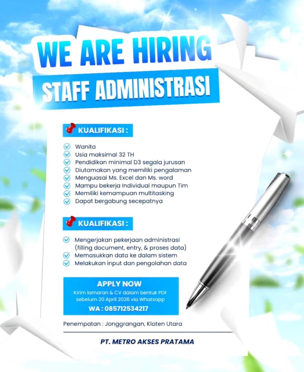 Cara Melamar: Kirim lamaran & CV dalam bentuk PDF sebelum 20 April 2026 via Whatsapp: 👉 WA: 085712534217
