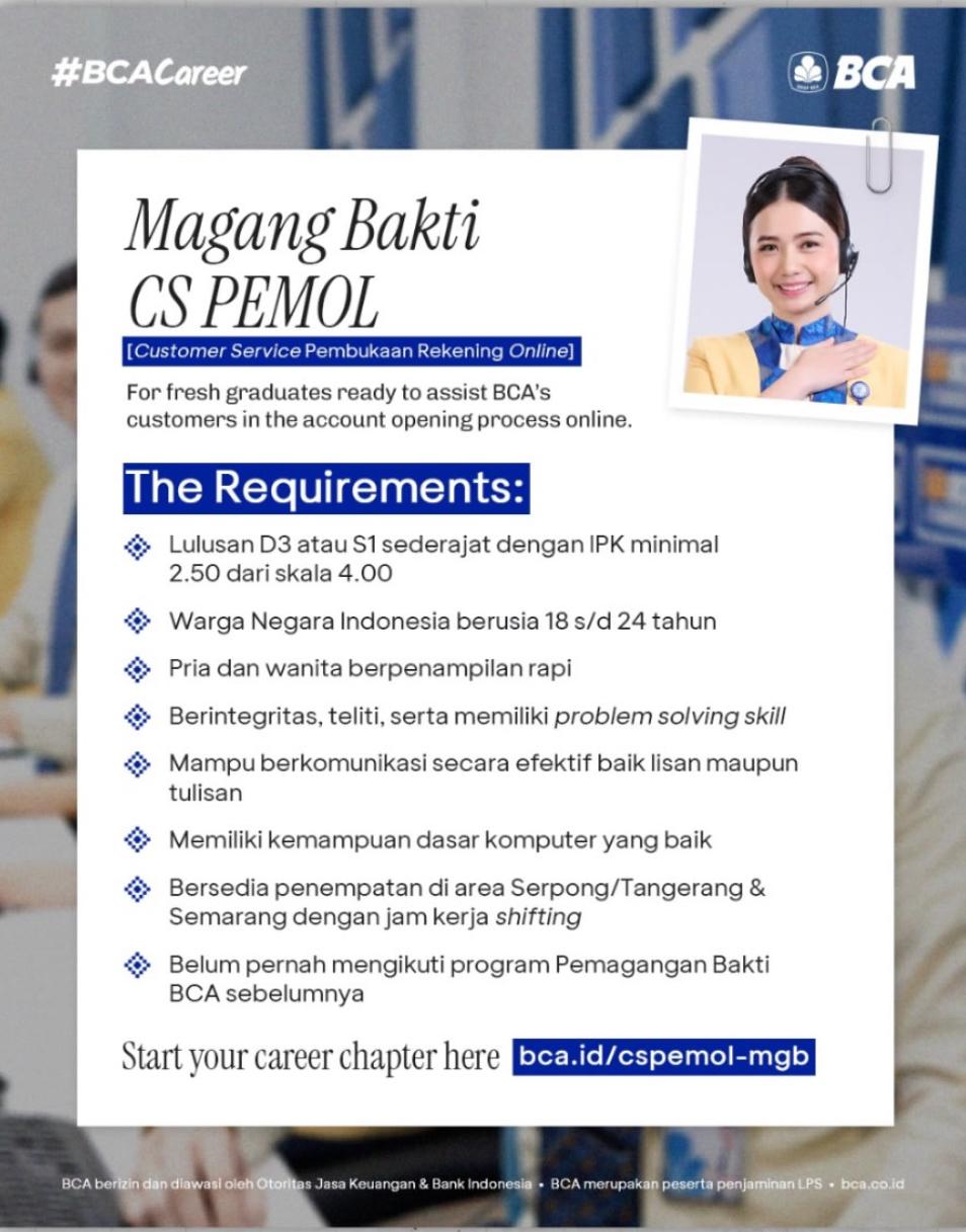 #BCACareer membuka kesempatan bagi fresh graduates untuk bergabung dalam program Magang Bakti sebagai CS PEMOL (Customer Service Pembukaan Rekening Online). Posisi ini siap membantu nasabah BCA dalam proses pembukaan rekening secara online.
