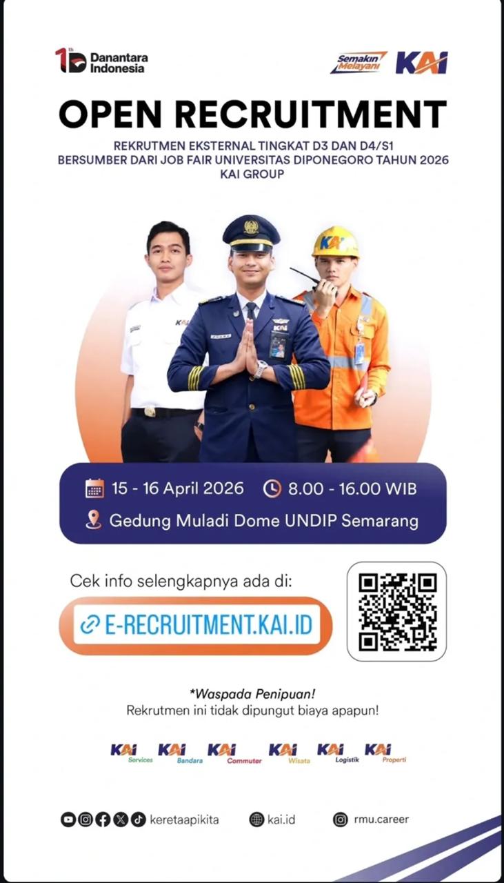 KAI Group bersama Danantara Indonesia mengadakan rekrutmen eksternal untuk lulusan D3 dan D4/S1 yang bersumber dari Job Fair Universitas Diponegoro Tahun 2026. Acara ini akan diselenggarakan di Gedung Muladi Dome UNDIP Semarang.